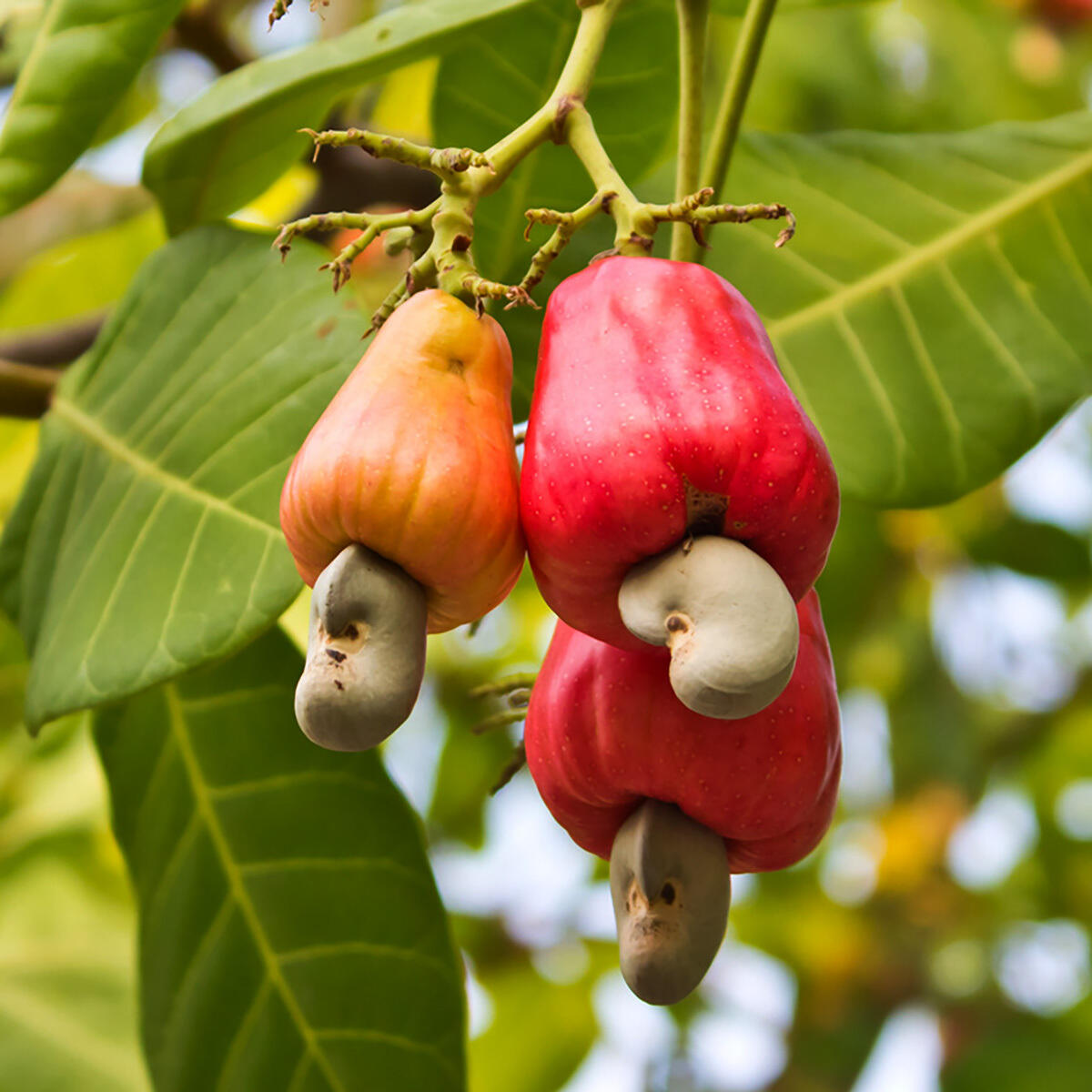 The yellow to red apples radiate from the foliage of the cashew tree from afar. Their coveted seeds are not hidden inside, but hang from the bottom of the apple. The cashew tree originally comes from Brazil. Today, cashews are also grown in Africa, India and South-East Asia. The tree finds optimal growing conditions in Indonesia. Our cashews are grown and processed there according to strict organic, Fairtrade and raw food criteria.